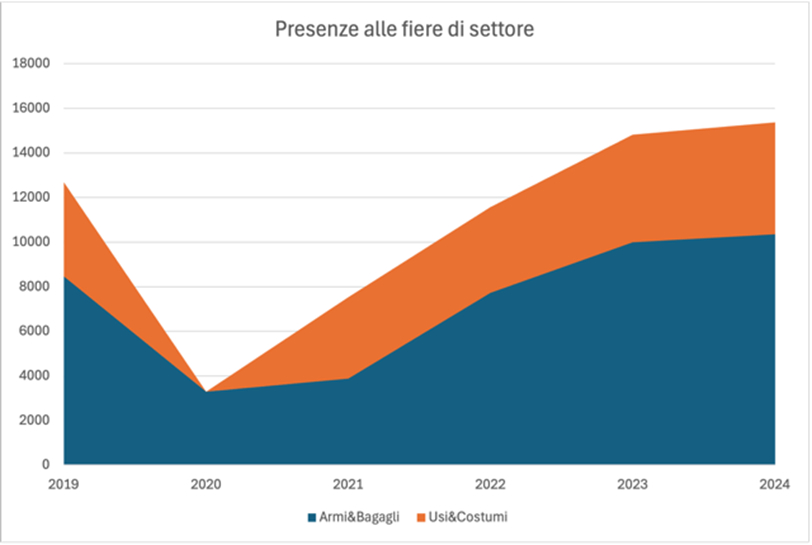 Si tratta di attività e prodotti indubbiamente specialistici e di nicchia, formalmente portati avanti da associazioni o piccole imprese, oggi rappresentate in almeno due fiere nazionali: Armi&Bagagli a Piacenza, nella primavera che precede la stagione rievocativa, e Usi&Costumi a Ferrara alla chiusura autunnale. La prima fiera esiste dal 2004, ha ospitato nel ventennale oltre 10.000 partecipanti paganti per 432 espositori con un fatturato di 50.000 €; la seconda, più recente, ha toccato quest'anno 5.000 partecipanti per 341 espositori e un fatturato di 30.000 €. Entrambe le manifestazioni negli ultimi due anni hanno superato i numeri di affluenza precedenti la pandemia.